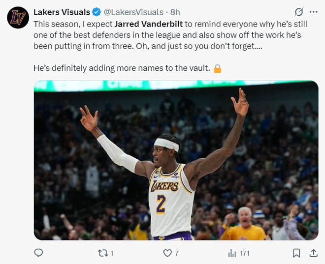 其实在八小时之前湖人媒体Lakers Visuals就力挺范德彪:本赛季我期待范德比尔特能再次成为联盟中最顶级的防守者之一,并且他会向外界展示他在三分投射上的努力。别忘了一点,他会在自己的保险库里添加更多需要锁定的名字。