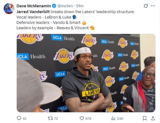 北京时间10月8日,湖人前锋贾里德-范德比尔特在球队的训练后接受了采访,他详细的向媒体解析了湖人队的领导架构: